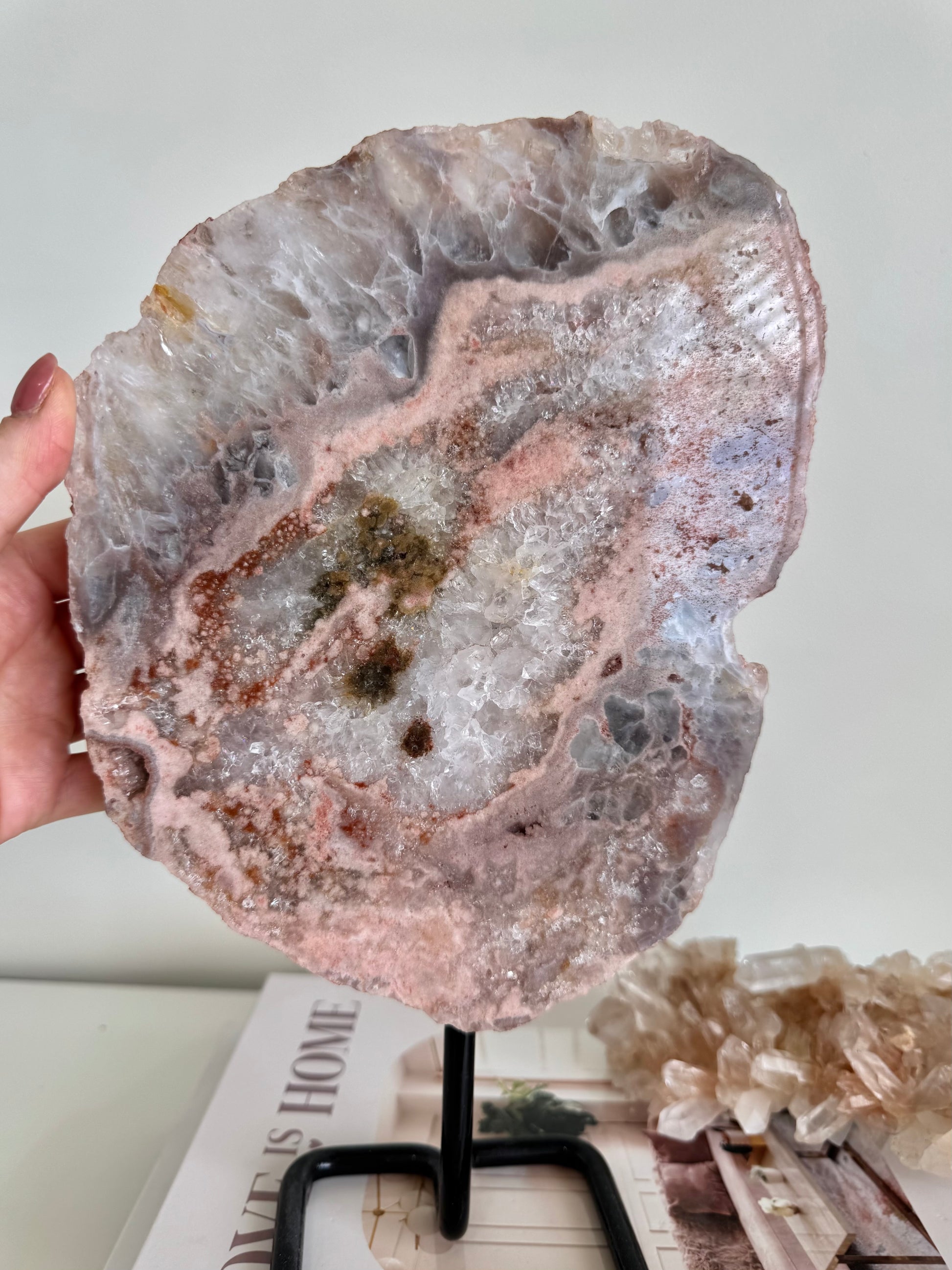This particular pink amethyst slab comes on a stand. It shows off its natural beauty on both sides with deep and light shades of pink and clear crystal pockets throughout. Style this statement piece in your living room or any place in your home to showcase its beauty to the world! Pink amethyst styles beautifully with minimal decor, neutral tones and soft pastel palettes to allow its beauty to really stand out and shine.